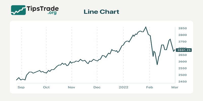 A line chart is the simplest form to represent price fluctuations over time, drawn with a continuous line. This line is formed by connecting the closing price points of each trading session, creating a visual overview of the trend. The horizontal axis of the chart represents the time frame, which can be days, weeks, or months, while the vertical axis shows the corresponding price levels. Due to this simplicity, the line chart helps viewers easily identify the overall market trend.