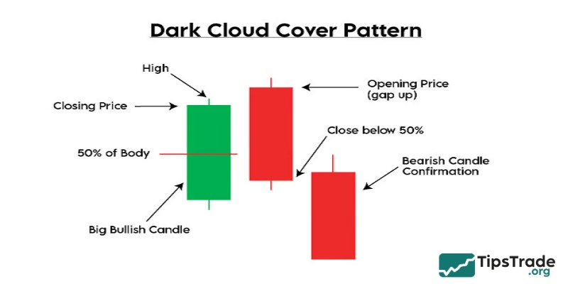 Dark Cloud Cover, also known as the Bearish Piercing Line, is a candlestick pattern that signals a potential trend reversal. The first candle in the pattern is a long bullish candle, while the second candle is a bearish one that opens above the closing price of the first candle and closes below 50% of the first candle’s real body.