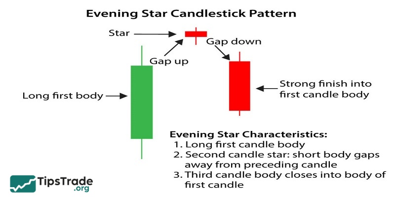 The first candle of Evening Star candlestick is a long bullish candle; the second candle has a small real body with an upward gap (the opening price of the second candle is higher than the closing price of the first candle); and the third candle is a strong bearish candle whose closing price falls within the real body of the first candle. The second candle may be a Doji. It is considered more reliable if there is a gap between the second and third candles.