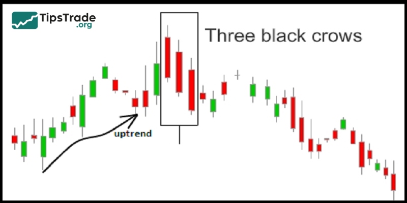 The Three Black Crows candlestick pattern appears after an uptrend. Each candle in the pattern is a bearish candle that closes near its low. The opening price of each candle is within the real body of the previous candle. A rare variation of the Three Black Crows pattern occurs when all three candles open at the same level as the closing price of the preceding candle.