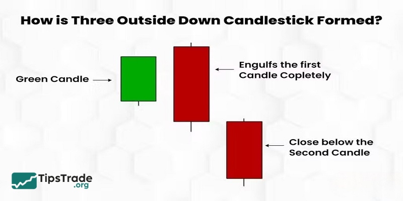 Three Outside Down is a Bearish Engulfing pattern with additional confirmation provided by a third bearish candle, which increases the reliability of the reversal signal. The market is in an uptrend. The first candle is a bullish candle with a small real body. The second candle is a bearish candle with a large real body, whose opening and closing prices are outside the real body of the first candle. The third candle is a bearish candle that closes below the low of the second candle.