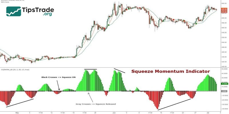 The Squeeze Momentum Indicator, created by LazyBear based on John Carter’s “TTM Squeeze,” provides entry and exit signals based on color changes, indicating market momentum. When a “squeeze” cycle appears, it often signals an upcoming trend, providing opportunities for traders.