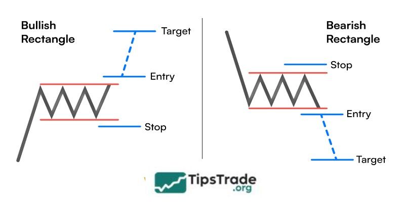 The rectangle pattern forms when the price fluctuates between a horizontal support line and a horizontal resistance line, creating a rectangle shape. This pattern often signals a pause in the current trend. After the price breaks out of the rectangle, the previous trend will usually continue.