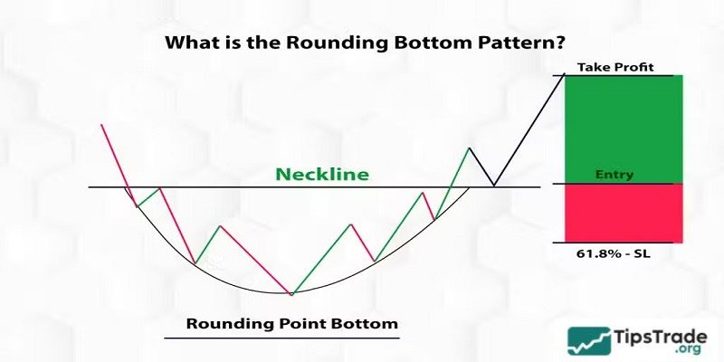 The Rounding Bottom pattern indicates a trend reversal from bearish to bullish. The shape of this pattern resembles an inverted U, indicating a gradual shift from selling pressure to buying pressure. When the price breaks above the neckline in an upward direction, it confirms the pattern and a new uptrend has begun.