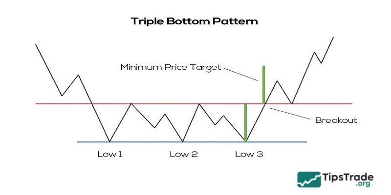Similar to the Double Bottom pattern, the Triple Bottom pattern forms when the price declines, touches the bottom three times at nearly the same level, creating a strong support zone. The uptrend began immediately after the price bounced from this support area and broke through the resistance line.
