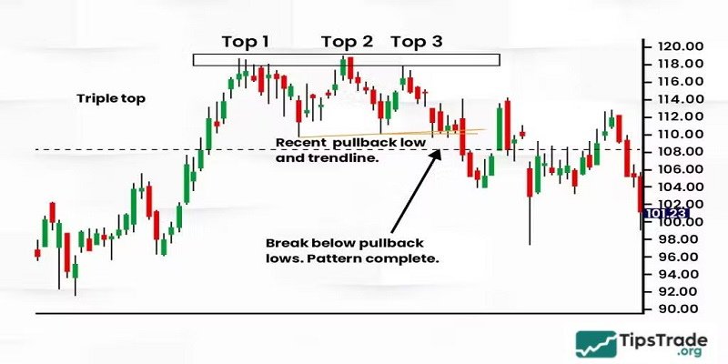 The Triple Top pattern resembles three consecutive mountain peaks and typically forms within 3 to 6 months. The appearance of the third peak confirms that the uptrend has peaked and a new downtrend is about to begin.