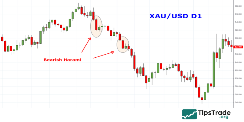 - The second small bearish candle: Forms within the range of the previous bullish candle’s body, indicating that buying pressure has weakened significantly. Sellers begin to enter the market, creating supply that pulls prices lower, although the strength is still limited. This candle signals hesitation among buyers and uncertainty from sellers.