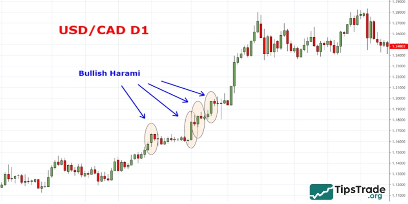 - The second small bullish candle: Appears within the range of the previous bearish candle’s body, indicating that selling pressure has weakened significantly. Buyers begin to enter the market, creating demand that pushes prices higher, although the strength is still limited. This candle reflects hesitation from sellers and uncertainty among buyers.