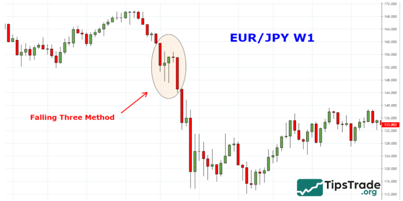 The Falling Three Method is described as a bearish reversal candlestick pattern, often appearing after an uptrend. Its significance lies in signaling the weakening of buying pressure and a high probability that the market will turn downward. More specifically, the meaning of this pattern can be explained as follows: