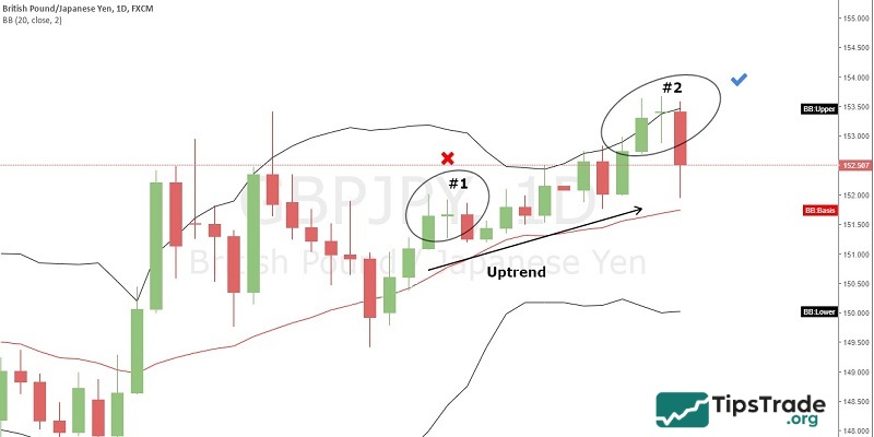 - Observe price touching or breaking above the upper band, indicating that the market is in an overbought condition.