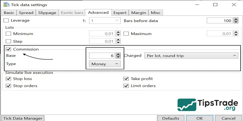 In the Basic tab of the Tick Data Settings, adjust the broker’s GMT offset and daylight savings time. Also, enable the Commission option and input the broker’s commission fees to model transaction costs accurately in the backtest.