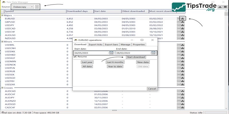 After installing TDS, open Tick Data Manager. Choose a broker and select the currency pair and time period for which you want to download tick data. Click the download icon and specify the time range to get the data.