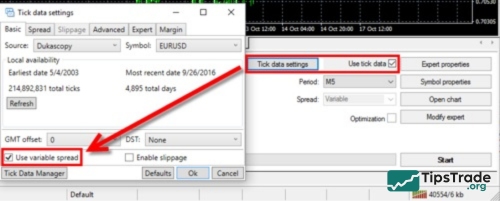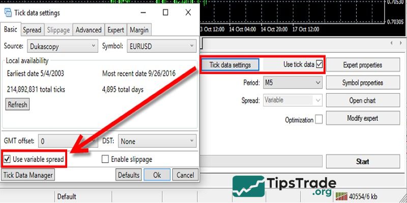 Go to the Tick Data Settings in TDS to simulate realistic trading conditions. Enable the “Use variable spread” option and select “Enable slippage“. This will recreate real market conditions, including potential delays and price deviations during live trading.
