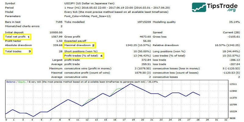 After the MT5 backtesting process is completed, the Backtest tab will appear. Professional traders advise that you should not focus solely on Total Net Profit. Instead, pay close attention to the following critical metrics: