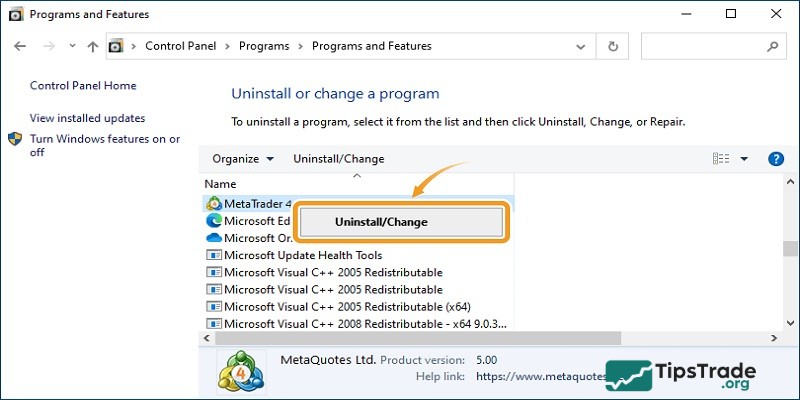 - In the list of installed software, find MetaTrader 4, right-click on it, and choose Uninstall.