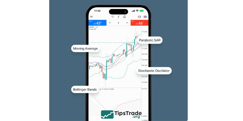 - Charts and indicators: Tap on the chart to display the menu, then select “Indicators” to add technical indicators to your chart.