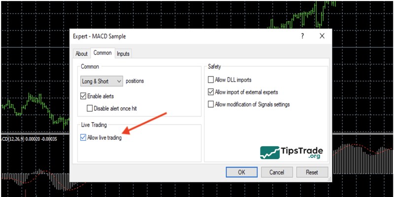 – Common tab: Check the boxes “Allow live trading” and “Allow DLL imports”.