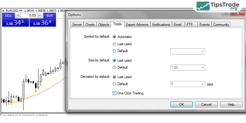 - Method 4: And finally, the fourth method is to make use of the MT4 (build 600) ‘One Click Trading’ feature which displays the Buy/Sell button directly on the top left corner of the chart. To enable this feature, you must first go to Tools>Options>Trade and select ‘One Click Trading’ When you select this the first time, you will have to accept the terms and conditions before you can make use of this feature. Note that this feature allows you to place orders with just a click and therefore should not be used unless you really know what you are doing.