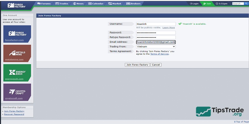 Once you decide to register, simply click on “Join” and fill in the required information as instructed below. Forex Factory does not require account verification, so after completing the registration, you just need to click “Login” next to it to sign in.