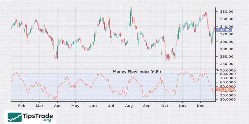 The MFI indicator is calculated using typical price and trading volume. It gives values between 0 and 100.