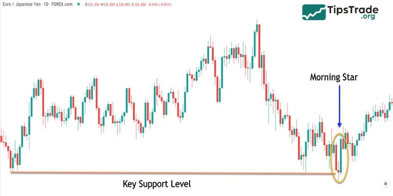 • Safe stop-loss point: Set the SL just below the lowest point of the second candle. This is the lowest point of the entire pattern; if price falls below this level, the structure of the Morning Star pattern is invalidated and the reversal signal is no longer valid.