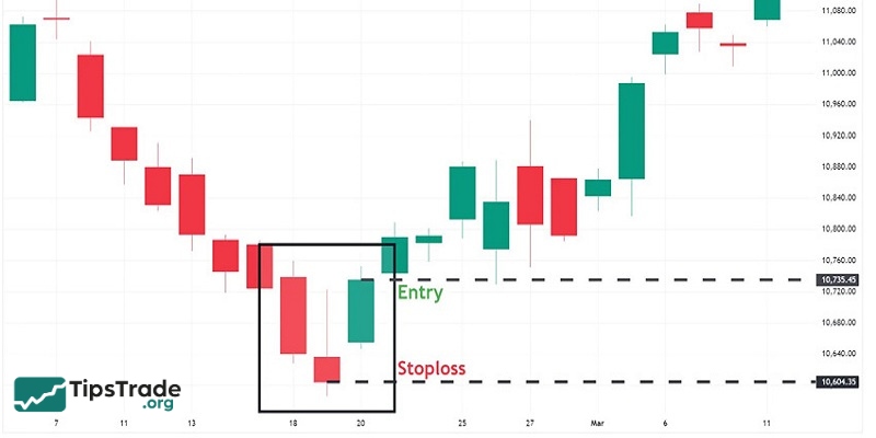 • Safe entry point: Place a buy order immediately after the confirmation candle closes above the closing price of the third candle. This entry is suitable for cautious traders.