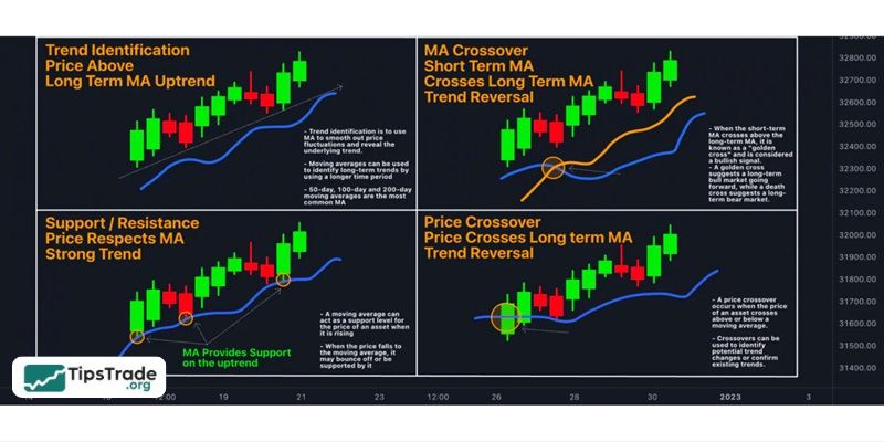 - Usage: Smooth price data to indicate the overall trend.