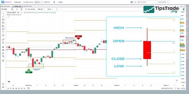 - Usage: Automatically calculates important support (S) and resistance (R) levels for the day based on the previous day’s price.