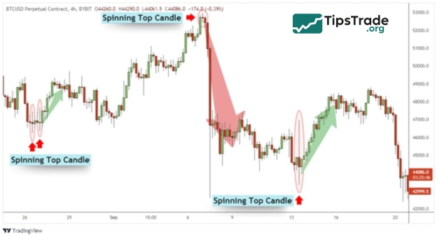 You need to observe the price chart and look for candles with small bodies located in the center, along with two long and equal wicks. These are Spinning Top candles. You should also pay attention to the color of the candles, green or red, to understand the short-term trend of the market.