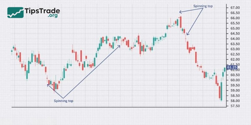 - Potential reversal signal: If it appears in a downtrend, the Spinning Top may indicate that buying pressure is returning and prices could move higher. Conversely, when it forms in an uptrend, it may signal that selling pressure is about to increase. However, the reversal signal is not very strong on its own.