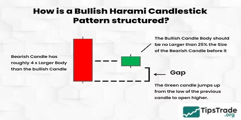 The Bullish Harami candlestick pattern consists of 2 candles and has the following characteristics: