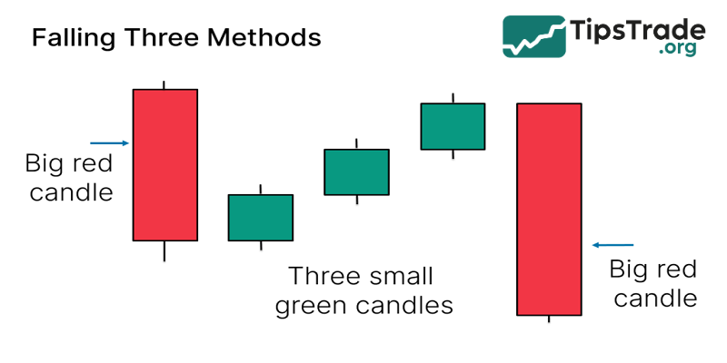 The Falling Three Methods candlestick pattern is used to predict the continuation of an uptrend, consisting of 5 candles (2 bearish candles, 3 bullish candles).