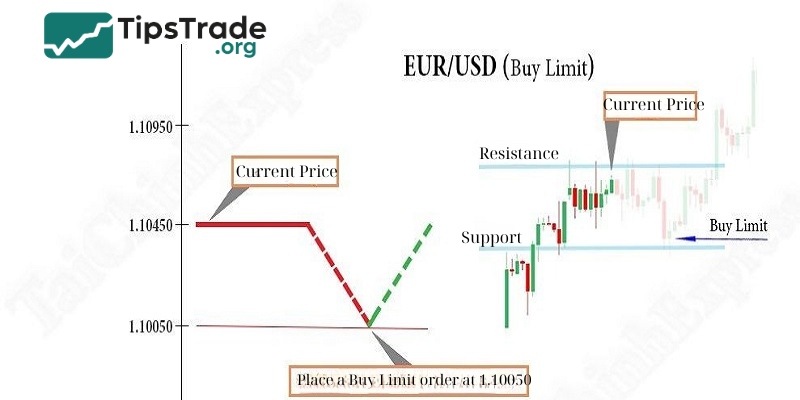 Buy Limit is a pending buy order, set up when a trader expects to buy at a better, lower price than the current market price. Therefore, instead of placing a Market Order, the investor will place a Buy Limit order to wait for the price to drop to the bottom and prepare to reverse before proceeding with the purchase. When the price drops and reaches the order point, the buy position is automatically activated.