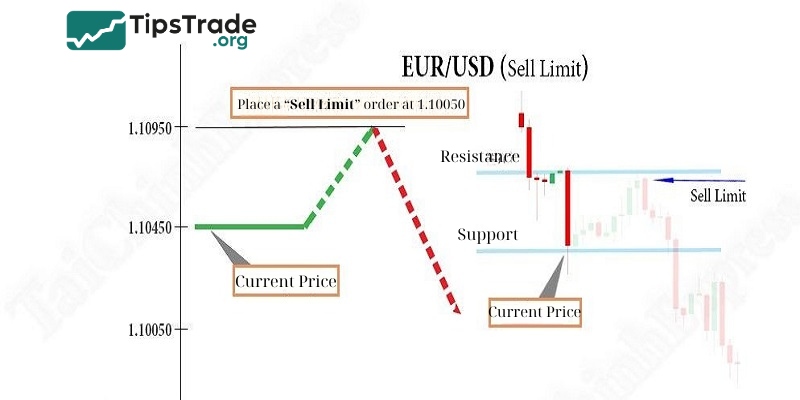 For example: You want to sell the EUR/USD pair. The current exchange rate is 1.10450, and you expect that you can sell at a higher price later. In that case, you will place a Sell Limit order at a price higher than 1.10450, for example, at 1.10950. The Sell Limit order will be triggered if the exchange rate of the EUR/USD pair reaches 1.10950 or higher.