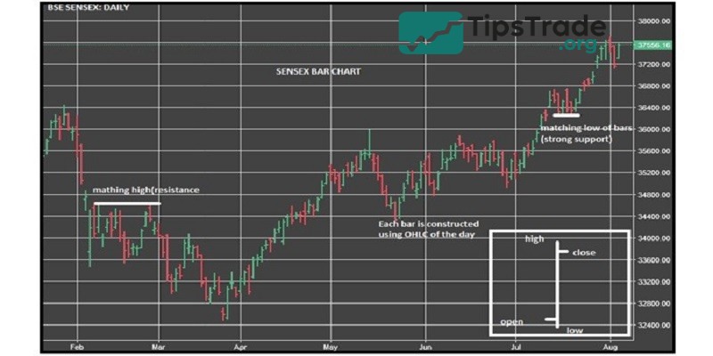 Basically, bar charts are also a type of graph that shows the fluctuations of stock prices over time. Its main components include: