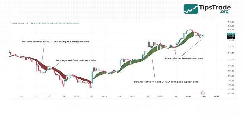 - In an uptrend, if the price pulls back slightly and touches the Exponential Moving Average before bouncing up, it signals that the Exponential Moving Average is acting as dynamic support.