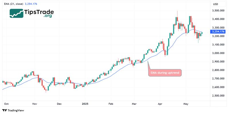 - During an uptrend, the price consistently stays above the Exponential Moving Average, while the Exponential Moving Average itself keeps rising.