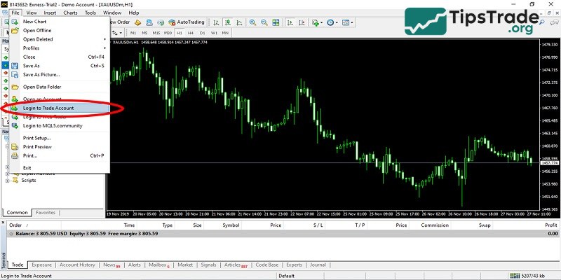 To log in to your MT4 account, select File -> Login to Trade Account.