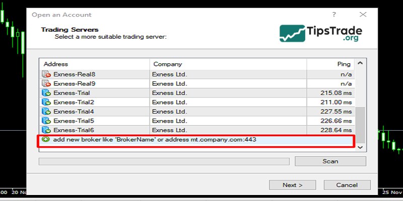 Note: In case you download MT4 from a different broker, the broker’s server you are trading with will not be available by default. Therefore, you can add a new server by: Selecting File -> choosing Open an account. Scroll down to the bottom of the server list, and you will see the line “add new broker like Brokername…” as shown in the image below: