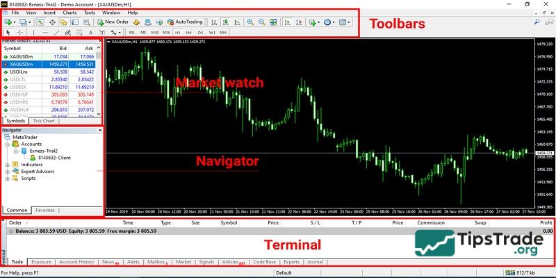 Navigator: Located in the bottom left, it displays the accounts, indicators, EAs, and scripts you have installed.