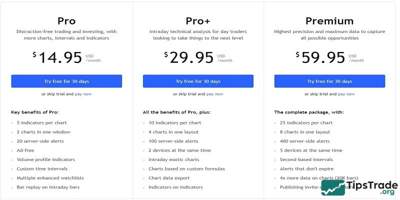 TradingView’s paid plans include Pro, Pro+, and Premium, with corresponding fees of $14.95/month, $29.95/month, and $59.95/month.